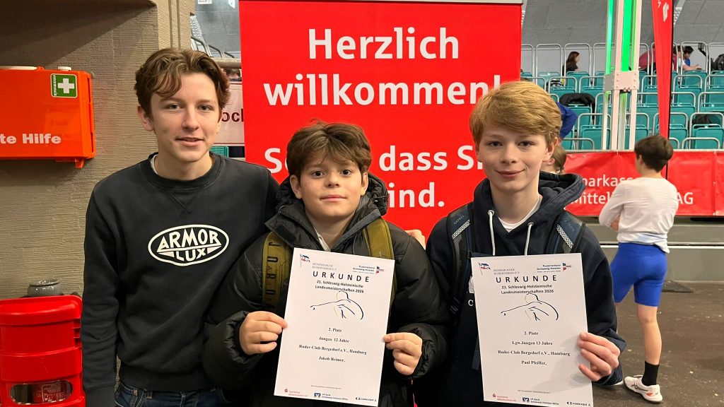 Jakob und Paul nahmen am Ruderergometer-Wettbewerb, der Schleswig-Holsteinischen Landesmeisterschaft, in Rendsburg teil. Jakob, der dieses Jahr zum ersten Mal an Wettbewerben teilnimmt, beschrieb die Veranstaltung als “ein sehr großes Event” und genoss die “besondere Energie” und den “starken Teamgeist”. Er startete in der Altersklasse Jungen 12 Jahre und erreichte den 2. Platz. Jakob lobte die gut funktionierenden Ergos, die große Halle und die Hamburger Mannschaft, mit der er an den Start ging. Er merkte humorvoll an: “Das Essen hat gut geschmeckt, hätte nur ein bisschen mehr sein dürfen 🙂”.
